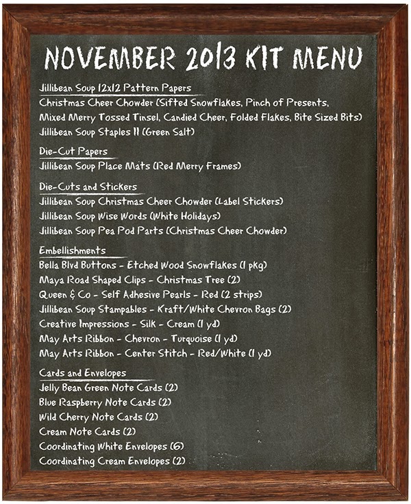 Hi everyone! I am excited to be this month's guest designer for Jillibean Soup's Card Kitchen Kit of the Month! This card kit may be new to you, but each month Jillibean Soup puts together a card kit with cardstock and envelopes for 8 cards, coordinating pattern papers, die cuts, stickers embellishments, ribbons and full instructions to make 8 cards.