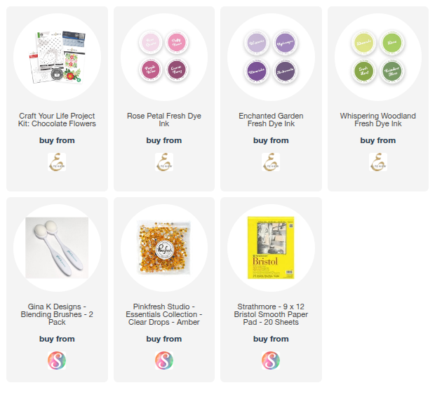 For my background, I used one of the kit's background stamps with Rose Quartz ink (part of the Rose Petals ink quad). I die cut the flowers and leaves from Bristol Smooth cardstock and inked them with the inks linked below. I assembled them, added a yellow gem in the flower centers and adhered everything down.