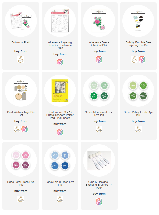 My card features the Botanical Plaid bundle which features a 6 in 1 stencil set with coordinating dies and I added the adorable bee from the Bubbly Bumble Bee die set. I used 5 of the stencils with the inks linked below on Bristol Smooth cardstock, the 6th stencil makes the vertical stripes (making it plaid).